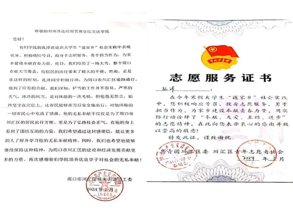 2024年2月,太阳集团tyc539收到一封来自周口市川汇区城南街道团工委的感谢信,信中对太阳集团tyc5392023级法本一班孔泽同学在寒假期间积极投身志愿服务扫雪活动的先进事迹进行充分肯定和表扬,随信寄来的还有共青团川汇区委、川汇区青年志愿者协会为孔泽同学发放志愿服务证书。