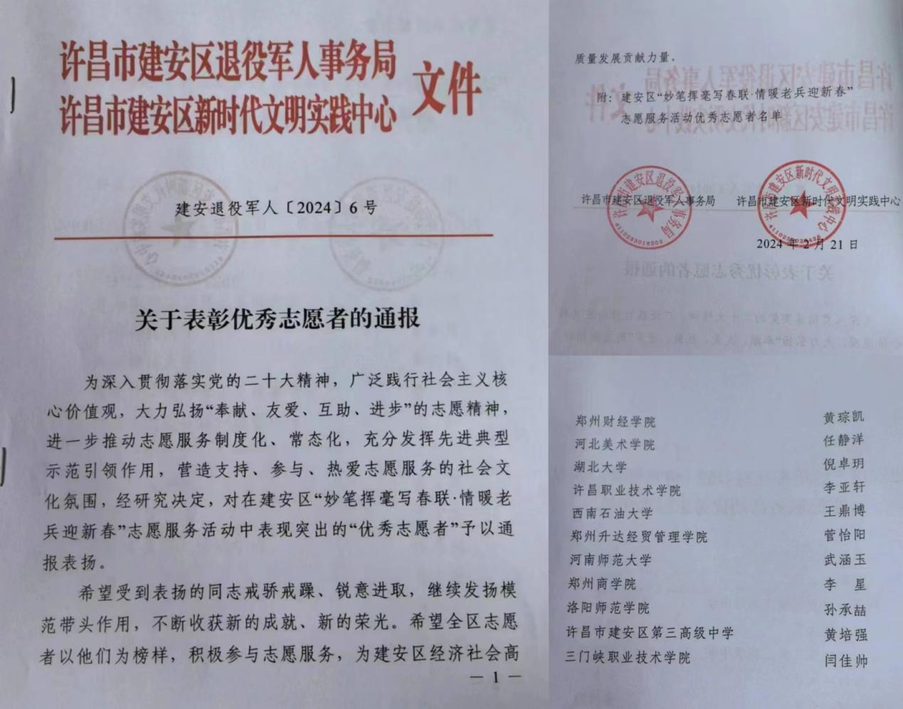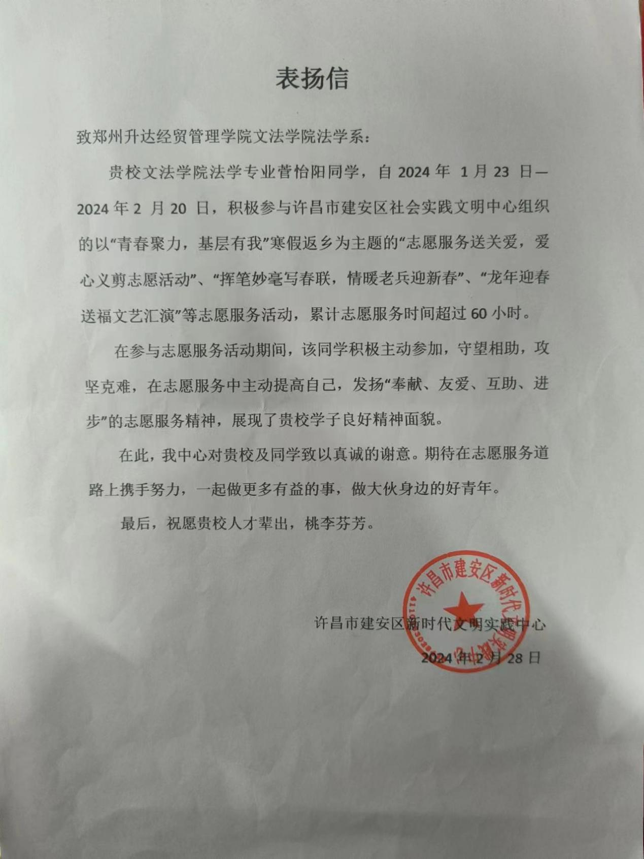 鲜衣怒马年少时,不负韶华行且知——许昌市建安区新时代文明实践中心来信感谢文法学子在志愿服务中的优异表现