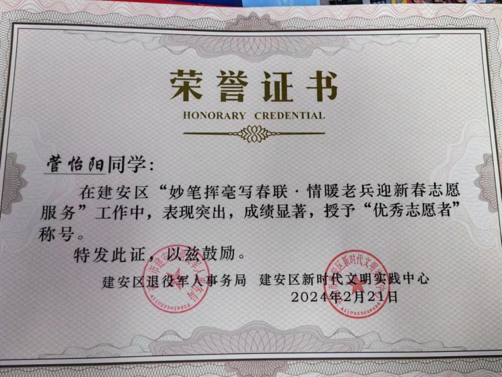 近日,许昌市新时代文明实践中心来信感谢并表扬太阳集团tyc5392023级法学本科四班的菅怡阳同学。寒假期间,菅怡阳同学响应太阳集团tyc539团委号召,积极参与“青心聚力,基层有我”寒假返乡志愿服务活动。在此次志愿服务过程中,菅怡阳同学主动参与并协助新时代文明实践中心为社区举办各项活动,锐意进取,表现突出,被授予了优秀志愿者的称号。