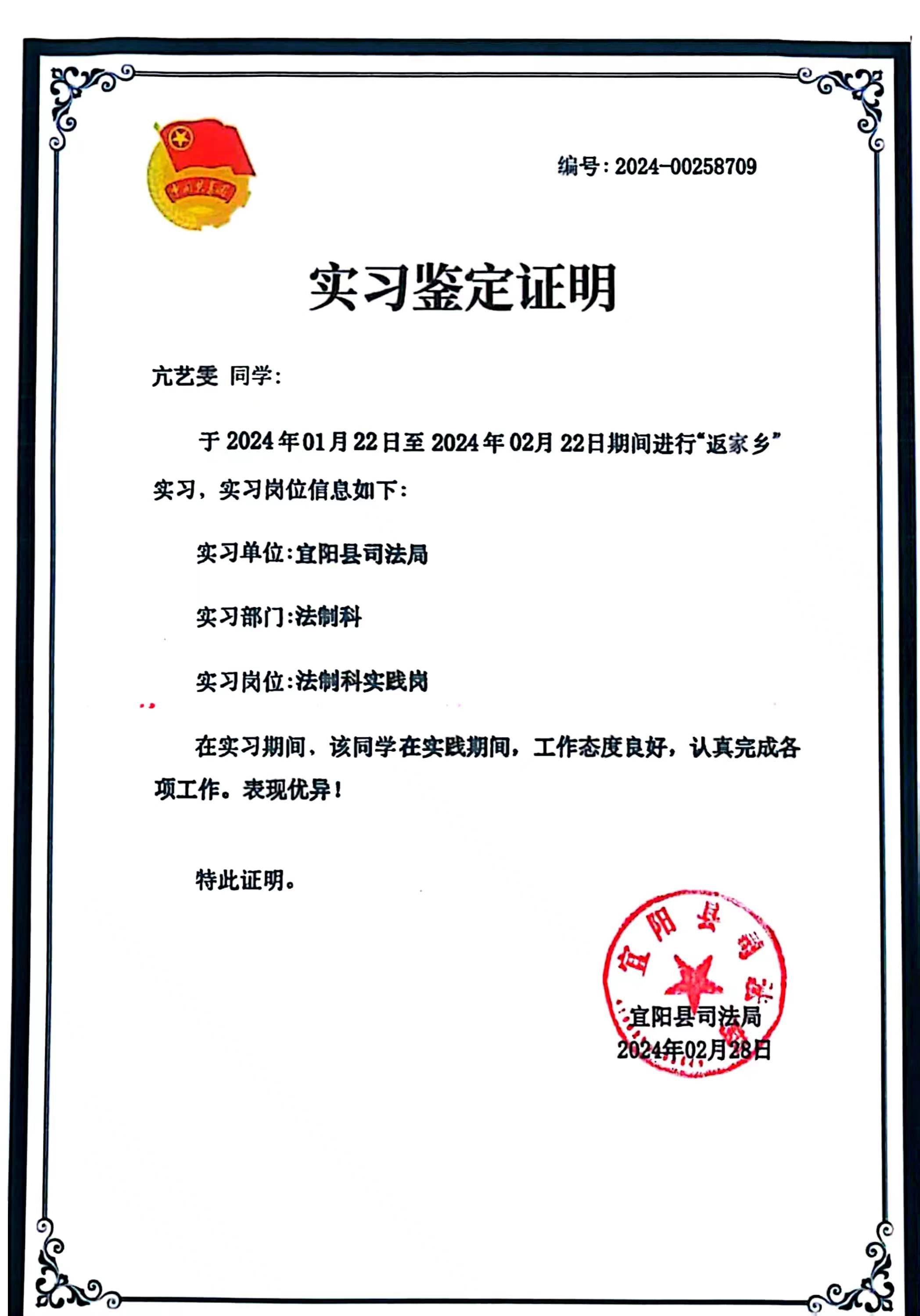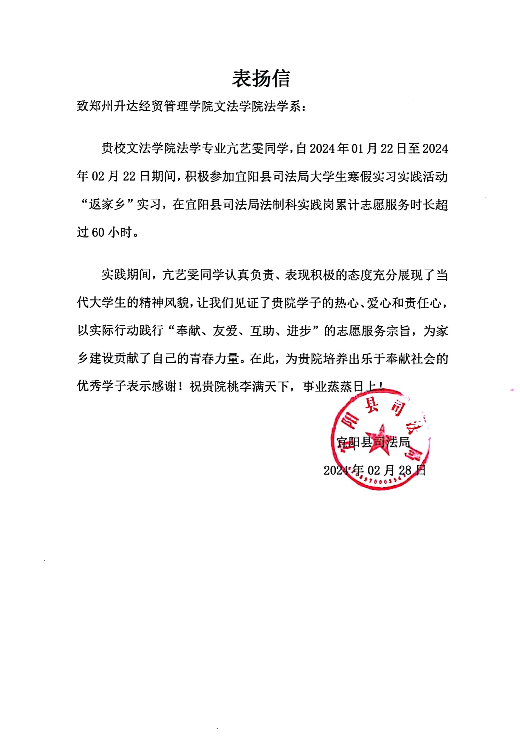 近日,太阳集团tyc539收到了一封来自于宜阳县司法局的来信。信中对太阳集团tyc5392023级法本2班亢艺雯同学在寒假期间积极响应老员工“返家乡”志愿服务活动号召,主动参加“宜阳县司法局法制科”寒假社会实践志愿服务活动的优秀表现给予了高度肯定和表扬。亢艺雯同学用自己的行动,为家乡的建设贡献出了自己的一份力量,为家乡人民带来了温暖,充分展现了升达学子的青春风采。
