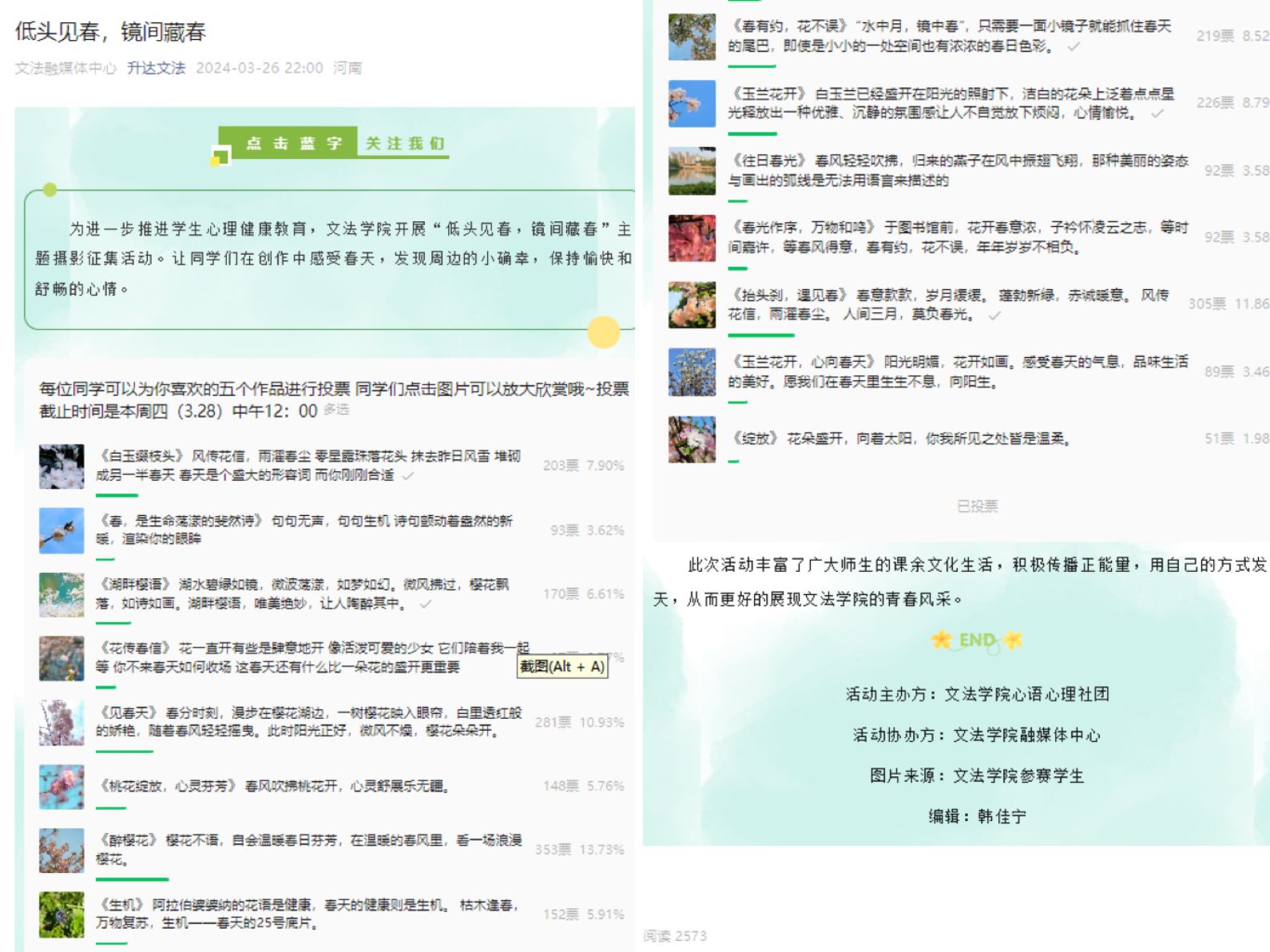 本次活动旨在让员工能够在创作中感受春天,用镜头记录春天,通过文案抒发对春天的期待和赞美,保持愉快和舒畅的心情,展现自己的风采。此次摄影征集活动得到了文法学子的积极响应,同学们踊跃参加,共征集到368幅员工摄影作品,经过初筛最终选出15幅优秀作品在“升达文法”微信公众号上发起线上投票,根据投票结果设立一等奖、二等奖、三等奖和创意奖若干。