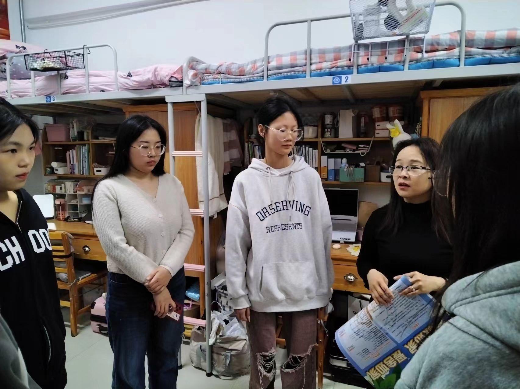 4月2日上午,辅导员王卫丽老师来到23级网络与新媒体专业员工宿舍,首先排查了各宿舍是否存在破坏限位器、私拉乱接电线、使用大功率电器、堆放易燃物品等安全隐患问题。她还组织宿舍长共同学习宿舍管理规定和文明宿舍的整理标准,并指导员工按照标准整理宿舍。