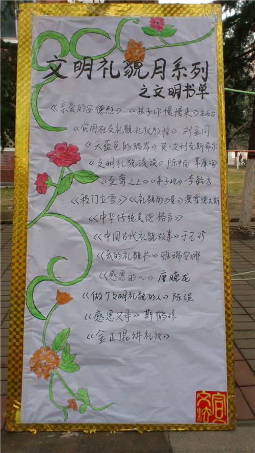 随后,由文法系宣传部制作的主题展板在学院主干道上展出,展板上详细列出了大家精心推选的16部书的书名及作者,本次“文明书籍推荐”活动的开展使文法系团学会成员通过自己前期的阅读、筛选,在推荐的过程中完成了自身学习和提高的目的,同时,通过向其他同学推荐,使大家在茫茫的书籍世界里更方便地找到这些有关文明、礼仪、感恩方面内容的书籍,既有利于在同学们中倡导爱读书、读好书的氛围,同时也传播了讲文明、懂礼貌、感恩父母的中华传统美德。