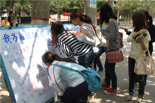 5月13号中午12时,文法学系团委组织部在龙湖食府前举行了“我为祖国献祝福暨庆祝建党九十周年”爱国签名活动。
