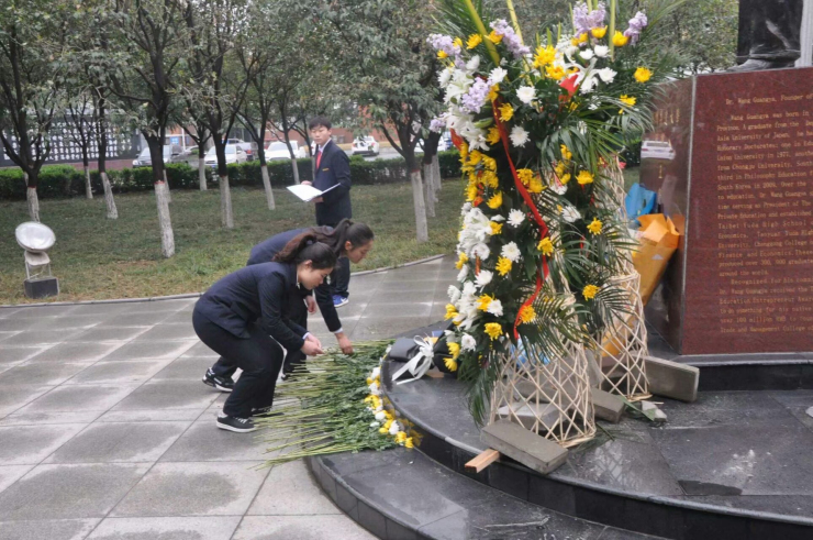 活动伊始,青志协干事将参加活动的成员有序带到指定地点,在主持人的开场辞中活动正式拉开帷幕。全体人员手捧花束,心中怀着对创办人的无限思念和感恩肃穆默哀,“清早起,扫庭院……”这些先生留下来的,早已刻在了师生脑海里的谆谆教诲仿佛又回荡在耳畔。接着,主持人带领大家回顾了创办人的一生,让同学们对这位伟大的老人有了更具体的了解,大家为先生倾尽毕生心血投身教育事业的精神深深感动。