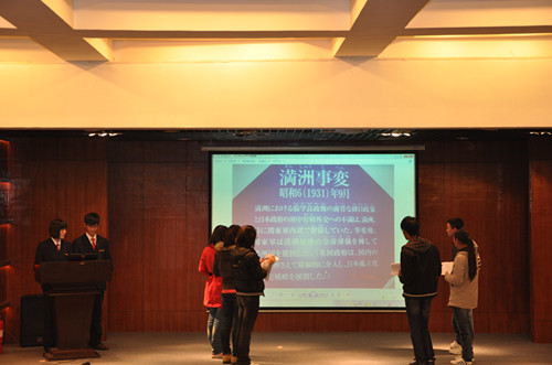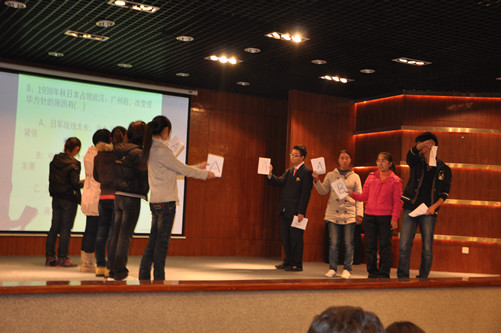 随后,比赛正式开始。第一环节是知识竞赛,在此环节中,参赛选手集体上场,以亮牌形式进行淘汰赛,选手们沉着冷静的应对比赛。接下来第二环节的复活赛,为第一轮淘汰的选手提供了又一个机会,选手们全力以赴,现场气氛活跃。第三环节的革命歌曲接力中,《红星闪闪》、《映山红》、《龙的传人》、《南泥湾》等一首首经典革命歌曲,不仅考验了同学们对革命歌曲的记忆能力,而且唤起了大家的革命情怀,引起了大家情感的共鸣,将比赛推向高潮。最后的图片识别环节,共有5幅图片,涉及日本侵华战争、东京审判等历史事件,同学们写出了其发生的时间、涉及人物等,加深了对历史的认知。此外,一个轻松有趣的游戏“踩报纸”缓解了比赛的紧张气氛,也让现场更多的同学参与到活动中来。