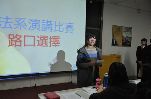 为了进一步推进校园文化建设,促进2012级新生之间的互动与交流,提高老员工的综合素质,10月24日晚,由文法系团委员工会主办的主题为“路口选择”的演讲比赛决赛在资讯楼315教室举行。出席本次比赛的嘉宾有文法系团委副书记王岑,员工会主席黄敏,员工会副主席刘浩、高茉然,2012级全体新生观看了此次比赛。