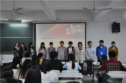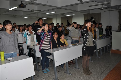 首先,全体起立奏唱共产主义青年团团歌。接着,大家一起欣赏了记录团学工作者成长历程的幻灯片,一帧帧照片把大家带到了美好而难忘的回忆中。然后,系团委副书记万珂同学做精彩致辞,她总结了我系去年团学工作取得的各项成绩,并以此激励新干事们接过上届学长们的接力棒,努力工作,续写文法新的辉煌。之后,主席团向各部干事颁发工作证,各部部长及干事们做简单的自我介绍,表达了做好工作的信心和决心。颁发工作证完毕,全体团学会成员在系员工会副主席杜梦杰同学的带领下,面向鲜艳的团旗,举起右拳,进行了庄严的宣誓仪式,坚定而执着的誓词表达了大家对团学工作的热爱。接着,郝艳海老师和郑玲玲老师分别作了发言并对新一届团学干部们提出工作希望。