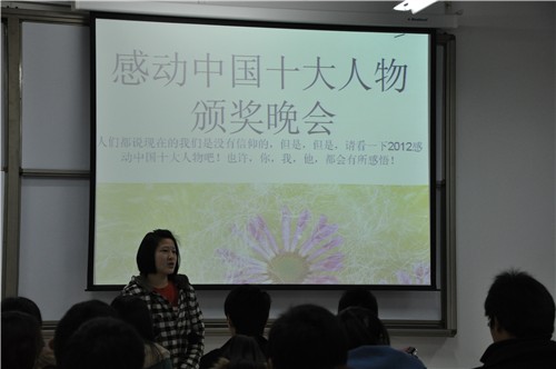 活动伊始,系团委副书记万珂为此次活动致开场辞,她首先阐述了自己对感动中国人物的理解,并希望大家能认真观看,继承和发扬感动中国人物身上的崇高精神和宝贵品质。
