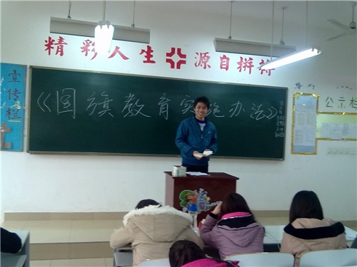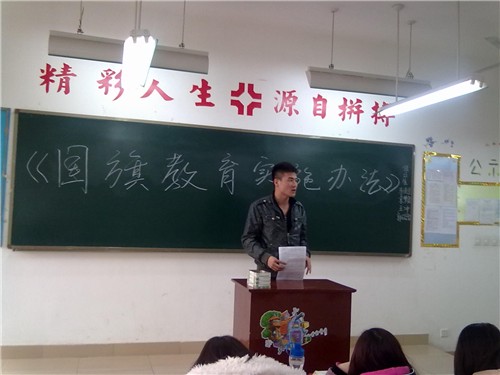 为了进一步加强老员工的爱国主义教育,感受到在国旗下的自豪以及升国旗时的庄严和肃穆感。3月9 日2011级团总支在年级团总支书记、辅导员刘玉梅老师的组织下,在各班主教室召开了“爱国爱校,向国旗敬礼”的主题班会,并深入学习了《国旗教育实施办法》相关内容,全体同学参加了此次会议。