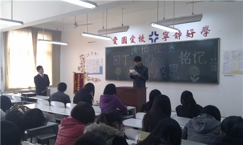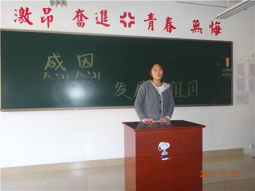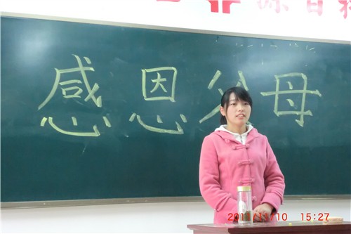 2011级各班在年级团总支书记、辅导员刘玉梅老师的倡议和组织下,在各班班委的具体安排下,积极开展五个一活动:1、做一件好事;2、读一篇关于感恩的故事;3 、学唱一首感恩歌曲;4、对身边的人写一段祝福,将感激铭记心中;5、同学们齐吟《游子吟》并认真思考父母为自己成长做的付出,然后给父母发一条短信,打一个电话,感谢父母。2011级法本一班还开展了以“红烛感恩”为主题的演讲比赛,并给优秀的选手给予奖励。