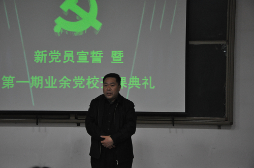 4月7日晚6:30,艺术系、文法系新党员入党宣誓暨第一期业余党校开课典礼在艺术楼104教室举行。艺术系党总支书记韦杨建同志、文法系党总支书记杨明志同志、文法系党总支组织委员郑玲玲同志以及两系员工党支部书记出席了本次典礼。典礼由文法系员工第四党支部书记彭凯主持进行。
