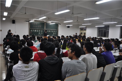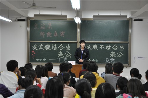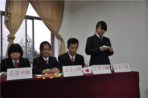 10月13日17:30,由文法系学艺部主办的面向文法系2011级新生的辩论表演赛在商管楼406教室举行。出席此次辩论表演赛的嘉宾有文法系行政秘书兼团委书记郑玲玲老师,2011级团总支书记刘玉梅老师,文法系原员工会主席申书芳同学,院辩论队队长刘文龙同学,院演讲与辩论协会副社长宋娇娇同学,院学艺部部长李真同学、副部长相海霖同学,国贸系团学会副主席温腾飞同学,营销系辩论队副队长狄金苹同学、辩论队主力队员宋帆同学,企管系辩论队主力队员田松凯同学、文法系主席团全体成员和文法系2011级全体员工。