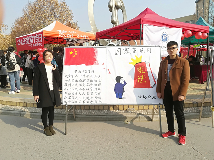 为充分营造12.4宪法日的宣传氛围,普及宪法知识,模拟法庭通过公司广播站向全校师生播报有关十九大精神和宪法的有关内容,掀起了师生学习了解宪法知识的热潮。另一方面,模拟法庭与中原工学院共同组织郑南高校法学联合会开展法制宣传活动。活动开始之前,模拟法庭的同学们积极进行筹备工作,营造了良好的宣传普法氛围。活动期间,同学们通过小游戏的方式引导路人参与到普法活动中来,增强了学习的趣味性,提高了大家学习宪法知识的积极性和热情。活动过程中工作人员还为大家发放升达法律咨询所的名片和资料,为升达法律咨询所可以为大家提供免费法律咨询服务作宣传。
