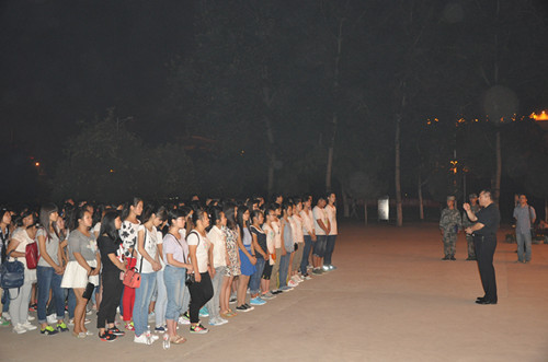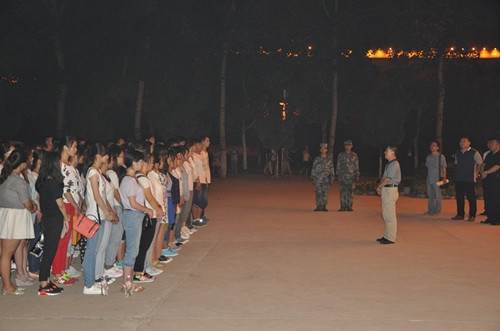 9月10日晚7:30,文法系2014级全体新生在思源会馆南门集合,系主任段丰乐、系党总支副书记杨明志以及2014级新生班辅导员老师一同来到新生军训场地慰问军训教官和14级新生。