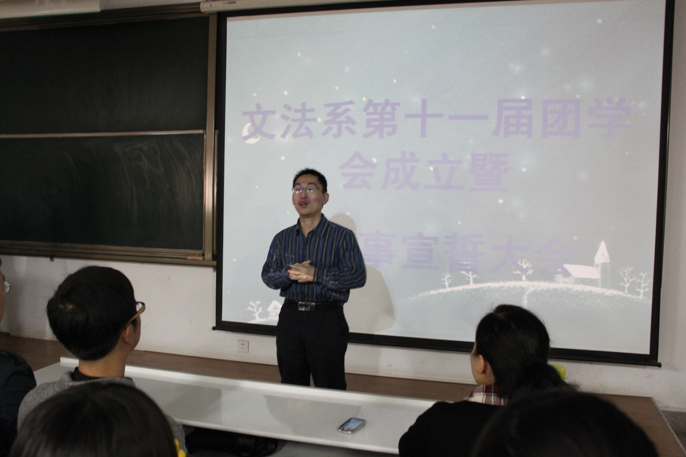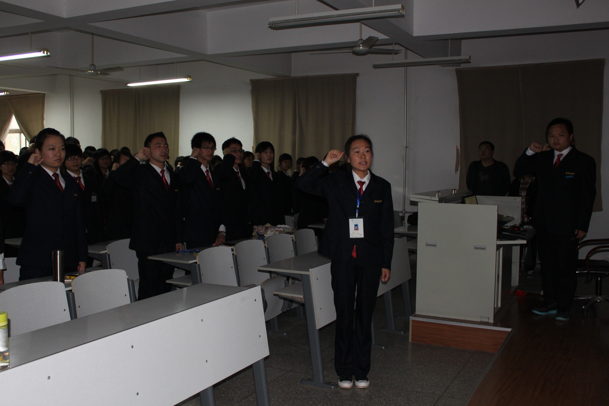 10月18日下午2点半,文法系第十一届团学会成立暨新干事宣誓大会在资讯楼415教室隆重举行。出席本次大会的嘉宾有文法系主任段丰乐老师,文法系行政秘书兼团委书记郑玲玲老师,文法系团委常务副书记兼2010级团总支书记郝艳海老师和2012级团总支书记彭凯老师,文法系第十一届团委员工会全体员工干部参加了此次大会。
