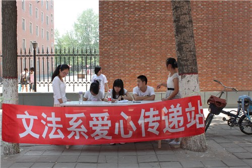爱心传递活动在文法系开展已久,已经形成了文法系欢送毕业生的一个传统活动。本次爱心传递活动为广大毕业生们提供了奉献爱心的平台,在优化资源之余,使在校生们感受到学长们浓浓的情谊。