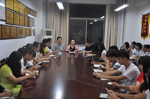 9月8日晚7:30,为迎新忙碌一天的师生齐聚文法系会议室召开新学期工作布置会,系行政秘书兼系团委书记郑玲玲老师主持并召开本次会议,系团委副书记郝艳海老师,彭凯老师以及系团委员工会全体员工干部参加会议。