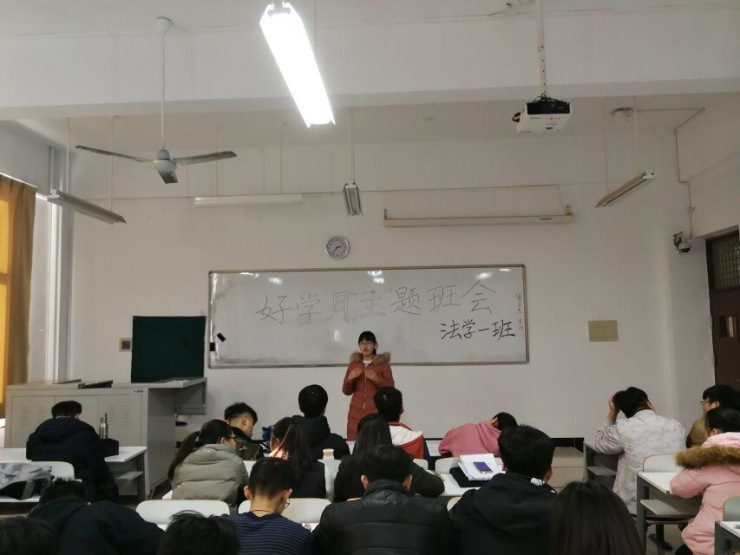 两位辅导员老师对此次班会高度重视,班会开始前,黑板上“践行党的十九大报告精神,养成好学习惯,争当学习榜样,立志成才”的班会主题格外醒目。两位老师详细讲解本次活动的意义、内容,同时也指出这是一次对于期末考试的动员,旨在动员大家共同营造认真复习备考,端正学风,诚信考试的良好氛围。让大家在学期将要结束的最后一个月,能够用饱满的精神、积极的学习态度来迎接考试。针对各班的不同情况,大家拟定了开展不同的学习活动,如兴趣小组,自觉开展早晚自习,精美笔记评选等等,各个活动都具体到每个负责人,负责活动的组织、实施和总结。