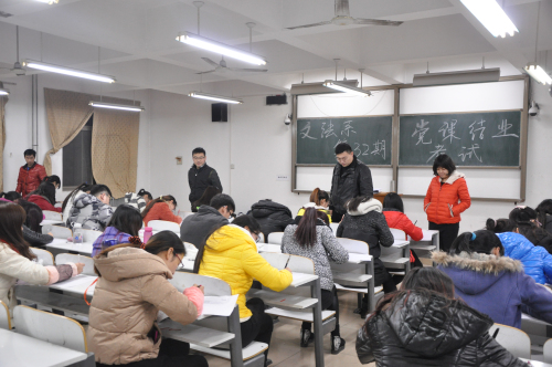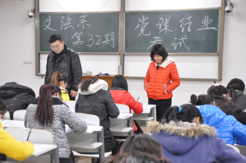 12月3日晚18:30,文法系党总支于商管楼406进行了第三十二期党课结业考试。此次考试时长为一个半小时,文法系代理行政秘书兼团委书记彭凯老师及辅导员郭青梅老师、刘建辉老师、吴艳豪老师监考了本场考试。