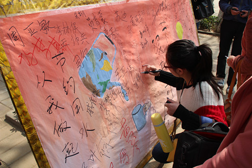 活动开始之前,文法系风纪部通过QQ空间、微博、贴吧、条幅的形式进行宣传,而且还在商管楼门前展出了两张关于节水知识的展板。19日中午十二点,在商管楼门口,举行了隆重的节水签名活动。很多同学在了解了“节水”的意义后,在签名板上留下了自己的姓名,并表示将在以后的生活中将节水行动进行到底,还将以此次活动为起点,在生活的各个方面践行节约理念,为共创节约型社会贡献力量。