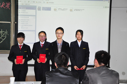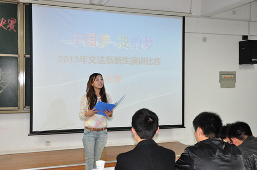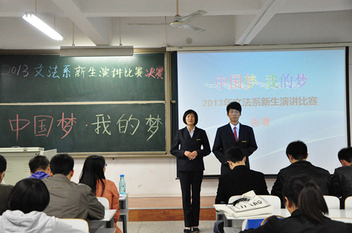 10月16日晚,文法系在资讯楼412教室举行一场以“中国梦、我的梦”为主题的演讲比赛。此次比赛一方面为了丰富老员工的校园生活,另一方面也为了给新生们一个表现自己才艺的舞台。出席此次比赛的嘉宾有文法系团委副书记焦宝华、员工会主席吴小宁、副主席汪雪洁、副主席郭俊杰、副主席贾丹彤、12级院演讲比赛第一名范义兵以及院员工会学艺部部长王珂和国贸系学艺部部长梁祥才。文法系13级新生到场观看了演讲赛。