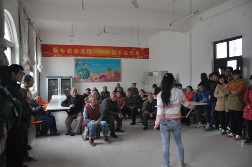 冒着菲菲的细雨,踏着泥泞的小路,公司文法系志愿者们打着彩旗,带着爱心步行前往敬老院。志愿者一到敬老院,就受到了老人们的热烈欢迎。志愿者们先简单询问了老人们的身体和生活状况。接着,他们纷纷展现了自己为老人们准备的精彩节目:优美动听的歌曲、震撼人心的武术以及雄健有力的正步赢得了老人们的阵阵掌声。其中豫剧演唱《刘大哥讲话理太偏》和黄梅戏表达了对老人们的亲切问候与满满祝福,更引发了老人们的无限感慨,让老人们热泪盈眶;歌曲《国家》也让老人们再次感受到了温暖人心的爱。最令老人们感到温暖的是在节目结束之后,志愿者们与老人们亲切的交谈与互动:有的老人向同学们讲述自己坎坷复杂的人生经历,给同学们传授自己的生活经验;有的老人和同学们进行象棋比赛,并向同学们传授自己的技艺;有的老人们甚至拿出自己的乐器,向同学们展示自己的绝技,这些让所有人都感到发自内心的开心,整个场面温馨感人,其乐融融。最后,在黄昏时分,老人们依依不舍地与同学们告别,并目送同学们离开了敬老院。
