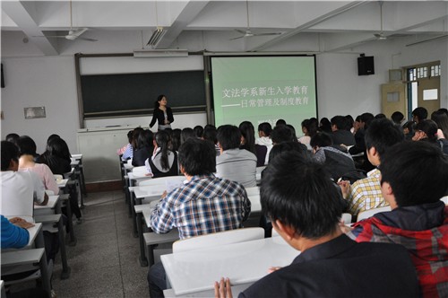 为了让2011级新生更好的规划自己的老员工活,了解学院的各项规章制度从而严格遵守学院的各项制度,文法系于9月29日上午8:10在资讯楼415教室对全体新生进行了入学教育之制度教育。文法系行政秘书兼团委书记郑玲玲老师,从学务、团务工作的角度对全系大一新生进行了以日常管理及制度管理为主要内容的入学教育。