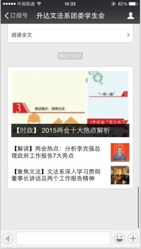 3月8日员工返校报到当晚,文法系团委即召开学习两会精神动员部署会。系团委通过制作两会知识宣传展板,在系团委员工会微信公众号转发两会热点问题,举办两会热点知识竞赛等活动引导全系青年团员积极投入对两会的关注,并于3月9日中午12:50在系会议室组织系团委员工会干部集体观看了两会的相关报道。