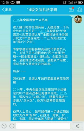 两会召开时,员工正值寒假,文法系团委按照院团委的要求,通过飞信、微信、微博、QQ等形式号召员工积极关注学习两会。系团委书记郑玲玲要求系团委员工会、各年级团总支、各班团支部通过制作壁报、手抄报宣传两会,通过报纸、电视、网络等各种媒体收听、收看两会,通过召开支部会、班会讨论学习两会精神。