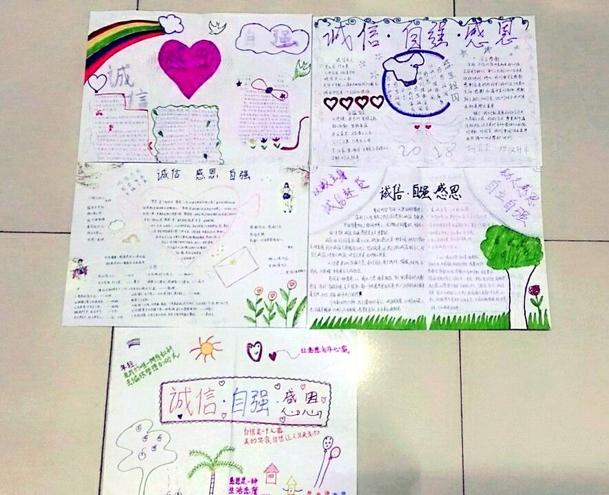 17学前专业各班组织班级同学开展诚信、自强、感恩手抄报活动,并评出17学前1班赵泽、17学前2班石孟欣等5名同学的手抄报作品,此项活动不仅丰富了员工们的课余生活,也让同学们在此过程中学会了诚信、感恩、自强。