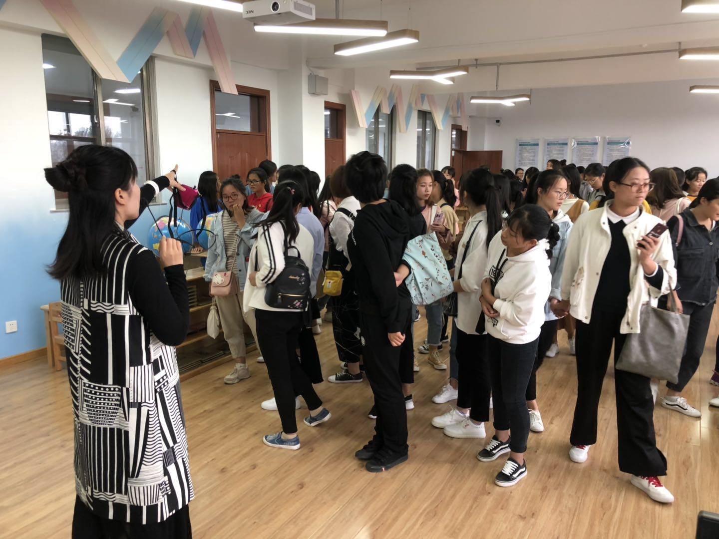 最后,王倩老师做了学前教育实训中心的简要介绍,并带领全体员工对学前实训中心进行参观,主要从实训中心的概况和实训基地的建设两个方面进行生动细致的讲解,使同学们更加直观的理解艺术类专业课程的特点。