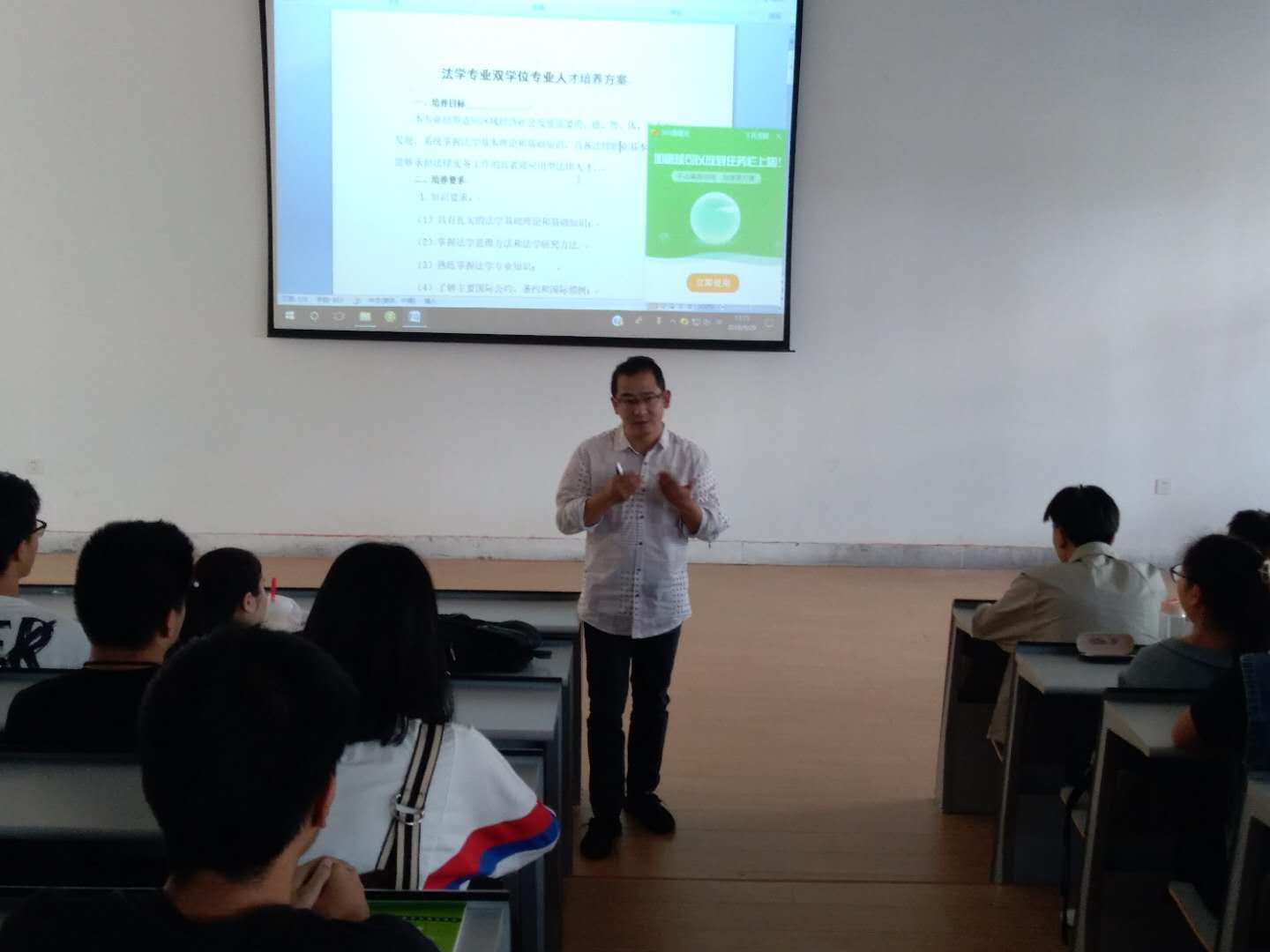 法学专业教研室主任刘凡义老师为同学们详细介绍了有关法学双学位的具体情况。刘老师从法学双学位对员工未来的用途谈起,讲到法学双学位的人才培养方案和双学位两年共四个学期的课程安排以及学习法学知识的具体方法,让同学们对接下来的学习安排有了更宏观的把握,学习目标也更加明确。通过刘老师的讲解,同学们更坚定了自己的选择,对未来的学习也更加有了信心。刘老师还给同学们提供了相关专业教材的信息,供大家选择。