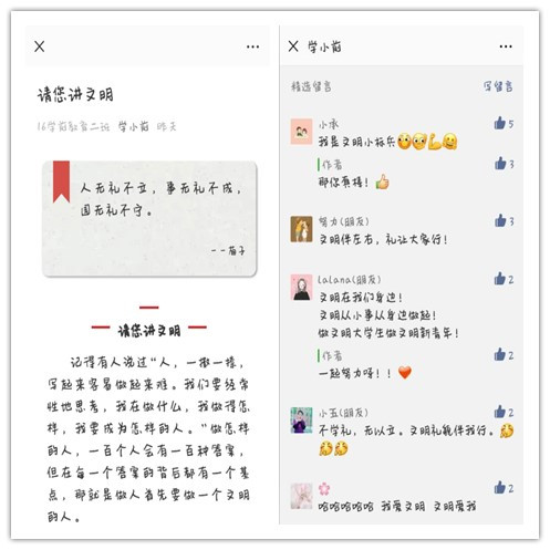 各班班委在微信公众号“学小前”平台发布关于文明礼仪的相关文章、故事等,鼓励同学们积极阅读、留言和转发,加深大家对文明礼貌的认识,同时将文明礼仪之花传递出去,大家一起为营造文明礼貌的校园文化环境努力。此次活动从“什么是礼仪”、“中华礼仪之邦的由来”等讲起,公众号中分享的文章和小故事充分展现了中华民族的文明典范和传承,号召大家在活动中联系生活实际,认识到文明礼仪的重要性。例如,不随手扔垃圾,进老师办公室敲门打报告,见老师问好等这些细节入手,对同学们的日常行为进行引导,倡导大家共同携手,培养文明礼貌的素质,创建和谐文明校园。