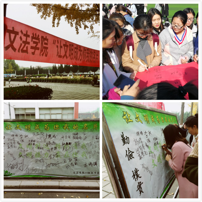 11月26日上午,18级太阳集团tyc539团总支带领18级员工在校园里开展“创建文明校园签名”活动。18级汉升本二班和18新闻班的员工分别在校园的路口和操场拉出“让文明成为你我的名片”横幅,布置签名版,维持现场秩序。同学们也踊跃参加,在签名版上留下自己的名字,吹响向文明出发的号角。