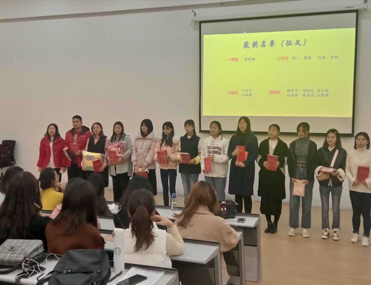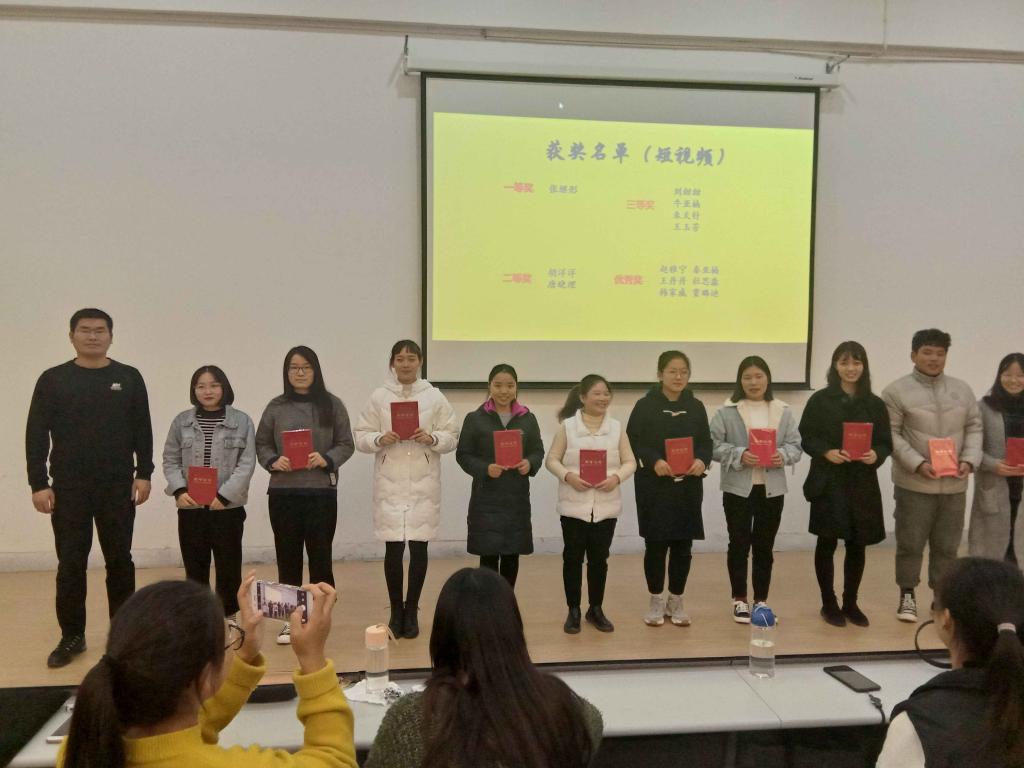 首先,李玉杰老师公布短视频和征文获奖名单,播放本次活动的获奖视频作品。然后,由公司心理专员李玉杰老师、18级张喜超老师为获奖人员颁发证书和奖品并合影留念;接下来,由团委副书记张明奇老师对此次大会作总结,他对积极参与本次活动的同学给予了充分肯定和高度评价,鼓励各班心理委员在以后做好各项宣传活动并组织同学们积极参加心理活动,也对心理委员以后的工作提出希望和要求,希望心理委员可以不断提高自身素质,认识到心理工作的重要性,并在班级里起到模范带头作用。