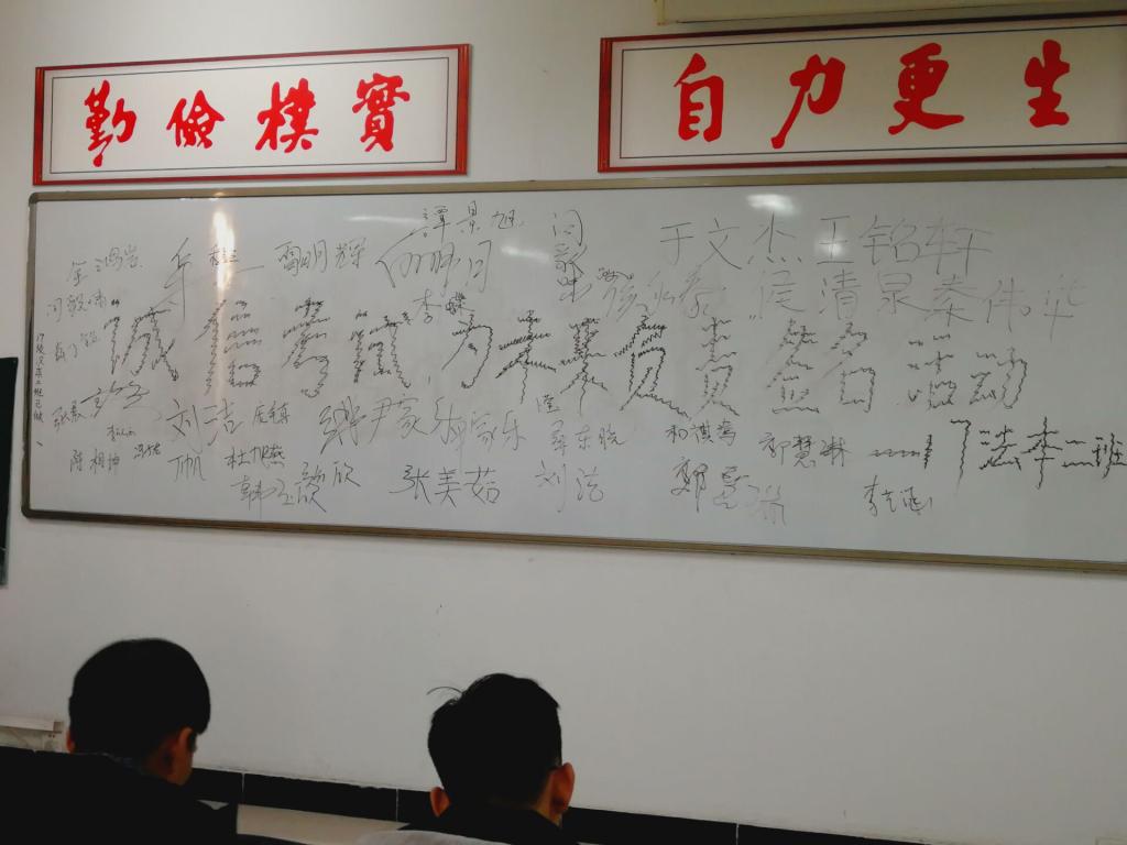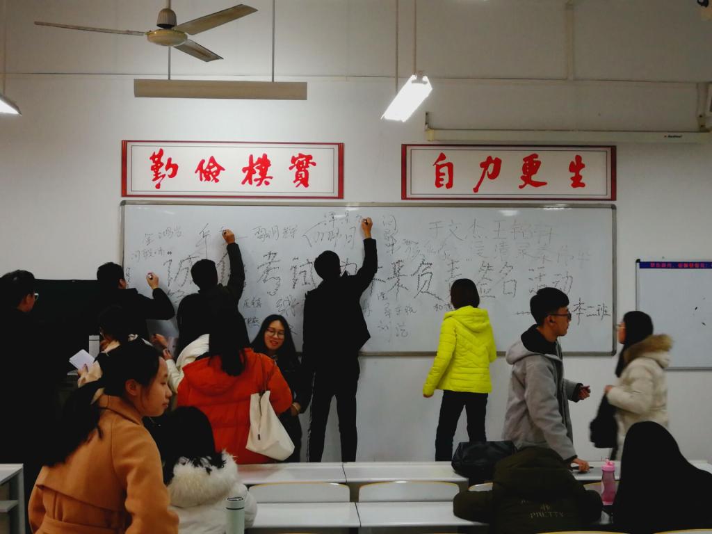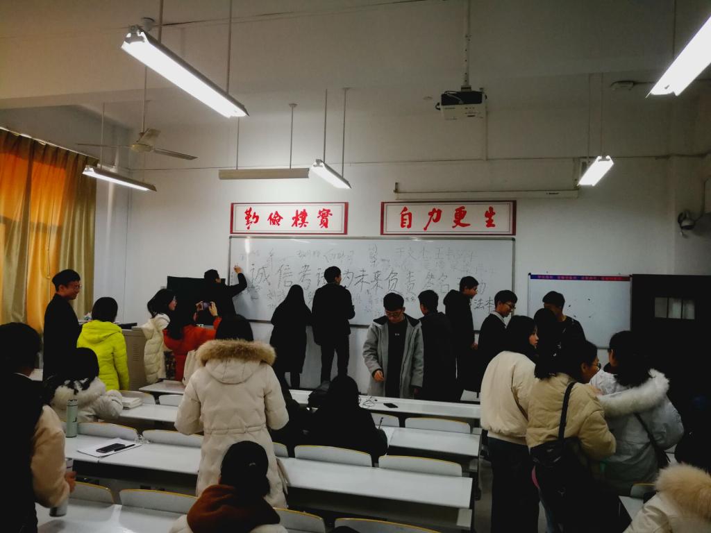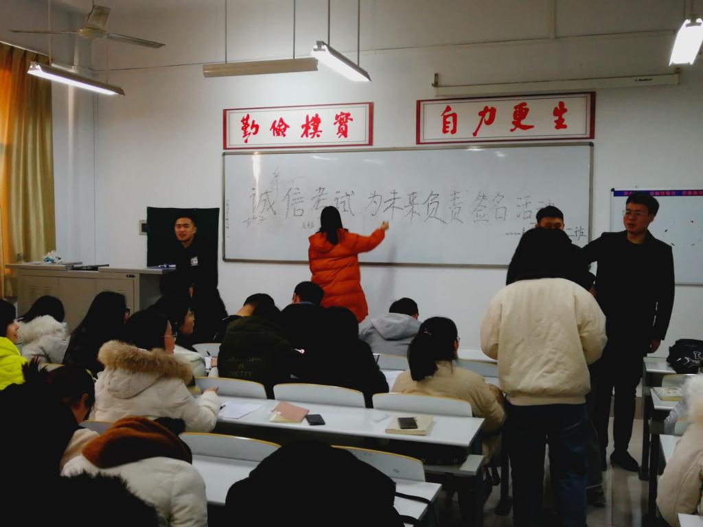 活动伊始,辅导员王松洁老师宣讲本次活动的意义,她提出“文明课堂,诚信考试,大家共同努力”的口号,王卫丽老师告诉我们:“诚信是个人立足之本”,诚信对老员工来说不仅是一种品行,更是一种责任,同学们诚信考试是对自己负责、对自身尊重。本次签名活动的出发点就是为了使同学们树立诚信考试的观念,及时劝诫、制止考试作弊行为的发生,为大家营造一个公平公正的考试环境。随后法学班班长闫毅啸带领同学们宣读诚信考试承诺书,接着同学们有序的在黑板上签下自己的名字。同学们一起留念拍照,让这次活动在心中更加刻骨铭心。最后各班学艺股长为大家讲解期末复习技巧,希望大家在期末考试中能取得好成绩。