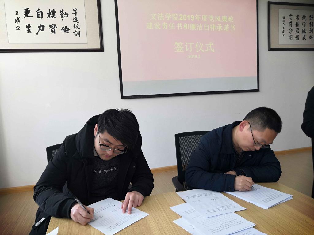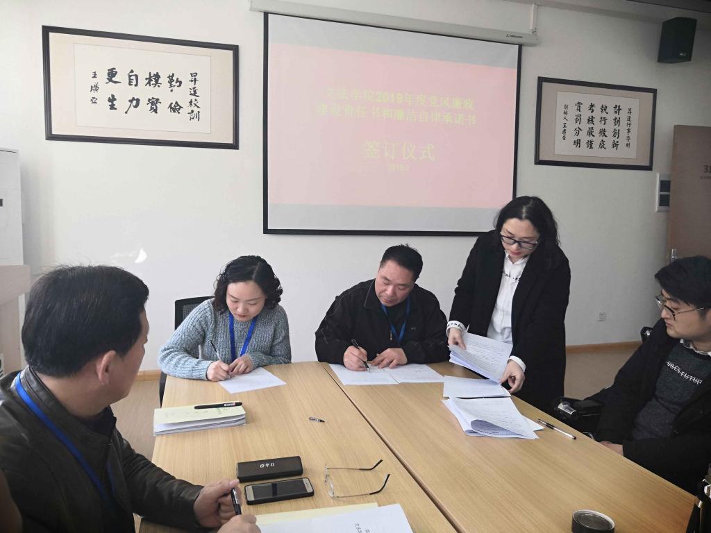 签订仪式由太阳集团tyc539党总支纪检委员田妍妍主持。首先,学院经理段丰乐与副经理签订“责任书”,随后,太阳集团tyc539党总支书记杨明志与行政秘书、辅导员签订“承诺书”,最后,段经理与全体专任教师、教学秘书及实验室管理员签订“承诺书”。