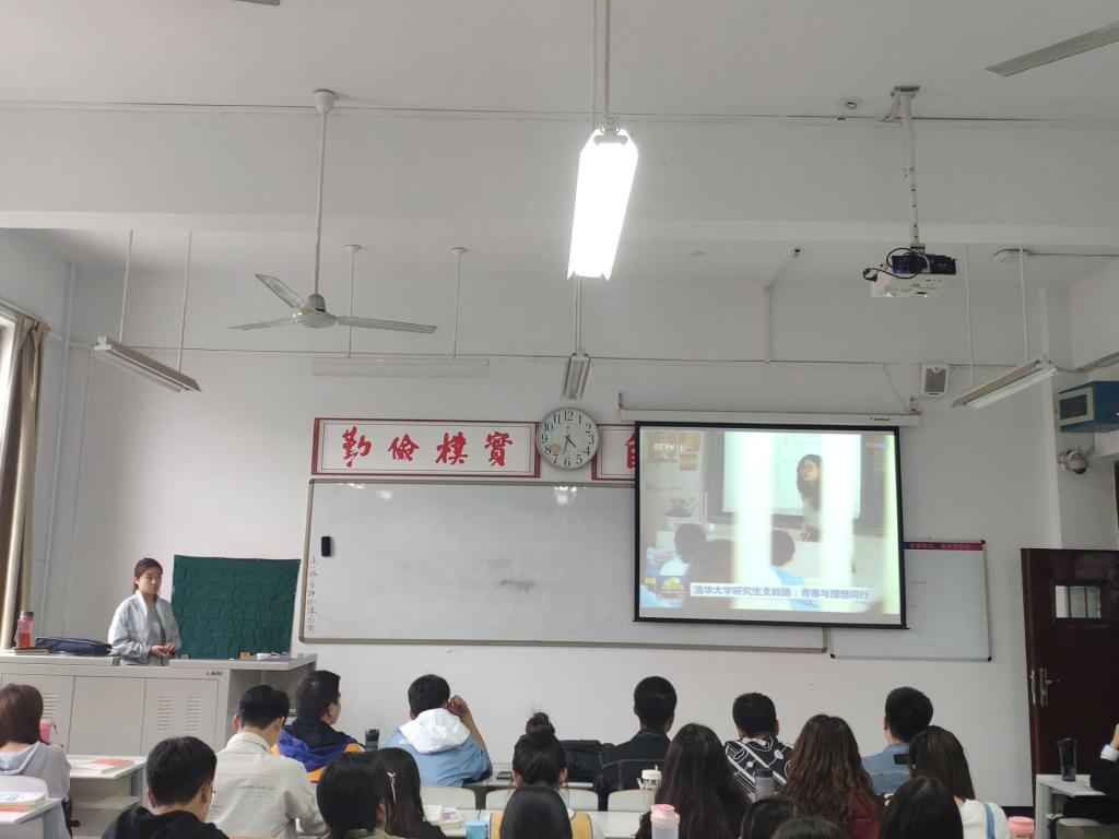 本次团日活动从观看新闻联播片段——“清华大学研究生支教团:青春与理想同行”开始,短片讲述了清华大学研究生,不顾条件的艰苦,前去偏远地区支教,在祖国最需要的地方贡献青春力量。同学们被清华大学研究生支教团勇于担当,吃苦耐劳的精神所感染。接着,李玉杰老师指出同学们正处于世界观、人生观、价值观的形成的关键时期,青年应树立正确的世界观,人生观,价值观,树立正确的人生目标,要立志勤学、修德、明辨、笃实、要有吃苦在前,享乐在后的精神。最后,李老师希望同学们争做有理想、有本领、有担当的新青年。要认真上好每一节课,做有理想的人;要打牢专业基础,做有本领的人;要艰苦奋斗,做有担当的人;要立志勤学,艰苦奋斗,放飞青春梦想。