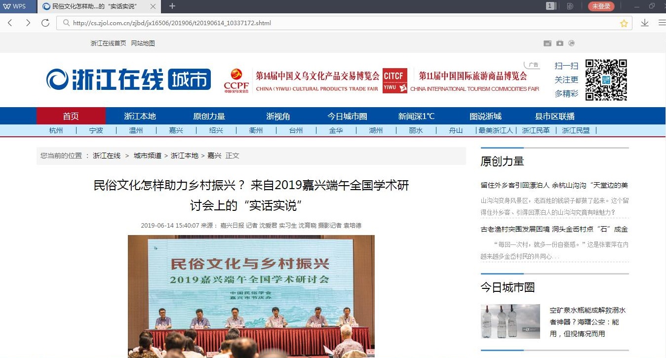 6月7-9日,来自海内外的近百位专家学者相聚嘉兴南湖畔,在“2019嘉兴端午全国学术研讨会”上,围绕国家顶层关注并精心设计的“民俗文化怎样助力乡村振兴”主题,发表真知灼见。太阳集团tyc539教授,豫闽台民俗文化研究所首席专家、所长吕书宝博士受邀参加了此次由“中国民俗学会”和“嘉兴市节庆活动组委会办公室”主办的研讨会。6月14日,浙江省委、省政府新闻门户网站“浙江在线”全文转载《嘉兴日报》文章《民俗文化怎样助力乡村振兴?来自2019嘉兴端午全国学术研讨会上的“实话实说”》,该文章对吕书宝教授关于民俗文化的系列观点和建议进行点评。
