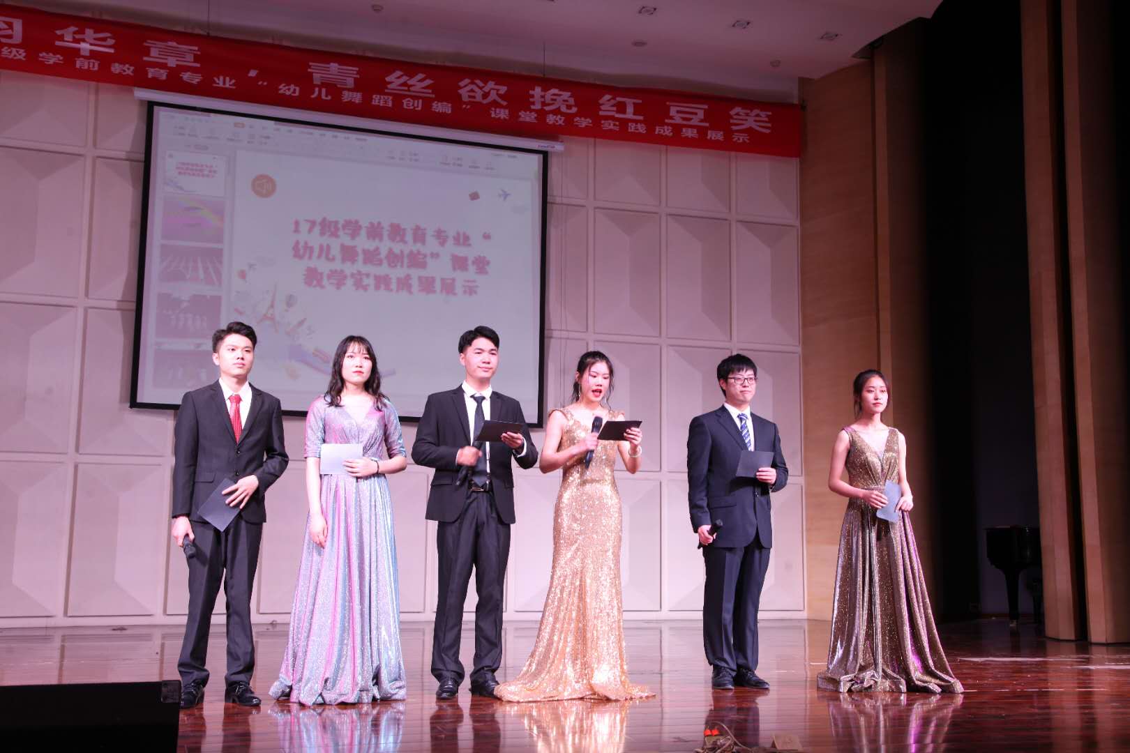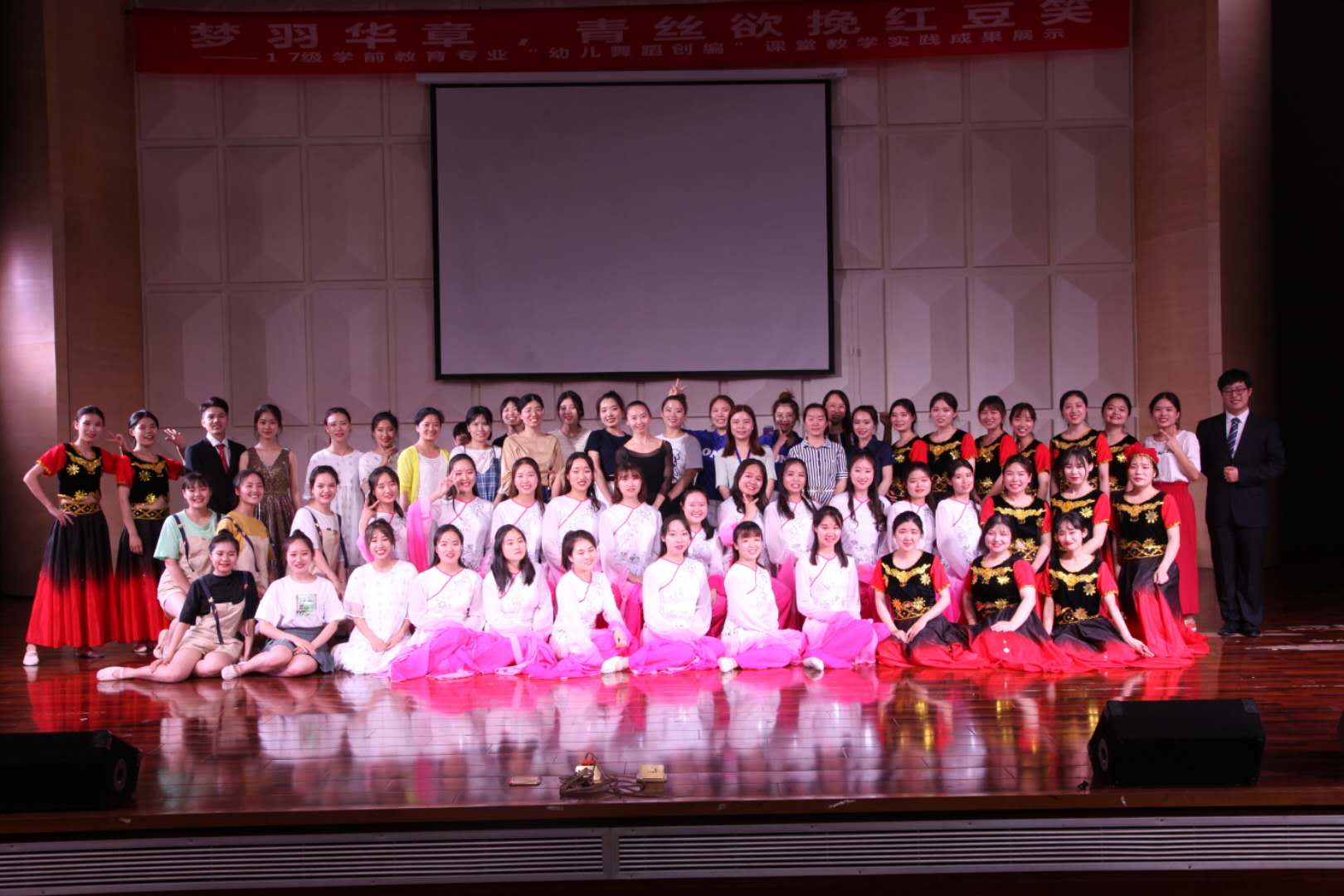 2019年6月13日下午14点30分,2017级学前教育专业幼儿舞蹈创编课堂教学实践成果展示如期在艺术楼音乐厅举行。出席这次活动的有太阳集团tyc539郑心灵副经理、教学秘书李南方老师、行政秘书郑玲玲老师、教研室主任闫振刚老师,还有学前专业的老师及来宾,约有500余人观看了演出。这次汇报表演是为了展示学前教育专业员工舞蹈学习的成果,同时也是进行“以能力为导向”的课堂教学评价改革的有益尝试。在谈倩老师的亲自指导下,员工们的节目赢得了台下观众的阵阵掌声,汇报演出取得了异常的成功。