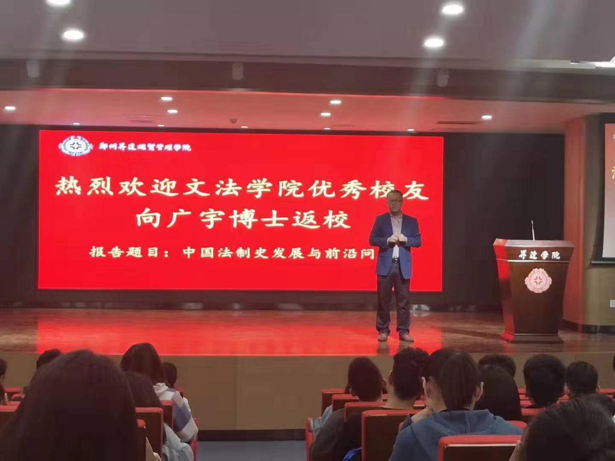向广宇博士是海南师范大学副教授,华东政法大学法制史博士,法制史研究专家。向广宇博士的报告分为两个部分,第一部分向博士从法制史角度讲解了租界的法律制度、简牍学习、律令问题等,深入阐释了中国法制史的发展与前沿问题;第二部分向博士回忆了自己在升达经贸管理学院的求学经历,感慨学校的快速发展,鼓励学弟学妹们珍惜宝贵学习时光,做好学习规划,努力学习,实现自己的人生理想。