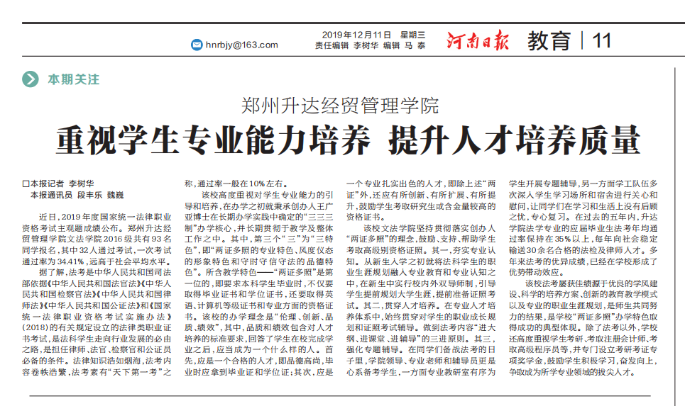 12月11日,河南日报教育版专题刊发了《太阳集团tyc重视员工专业能力培养 提升人才培养质量》一文,报道太阳集团tyc539法学专业在2019年度国家统一法律职业资格考试中取得的好成绩。现将全文转载如下:
