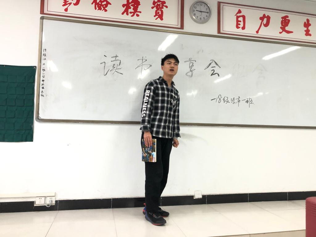 活动开始,由宇思颖同学向大家宣读本次活动流程。接着,大家按顺序一一上台分享。18级法本1班聂胜男同学带来的是小说《平凡的世界》。《平凡的世界》展示了普通小人物虽然在当时艰难的生存条件下,他们仍然怀着对美好生活的向往,克服重重困难,这种美好心灵与坚韧不拔的奋斗精神,值得大家学习。18级法本2班摆建芳同学推荐了小说《活着》,她认为这本小说在历史动荡的背景上以貌似冷漠的语调,以老人的一生浓缩进一个国家的历史,内容的深度及厚度都值得探究。随后18级法本2班薛金莹同学推荐了她所喜欢的书目:《告白》,她认为无论是从书中内涵,还是从描写手法上看,《告白》都算是悬疑推理小说的上品之做。这部小说的叙事结构极具特色,构思巧妙,抽丝剥茧般揭开案件真相的过程,令热爱推理侦探小说的同学欲罢不能。最后,18级团总支书记李玉杰老师对本次活动进行总结。她说:阅读的力量不仅仅在于让人增长知识,开阔眼界,更多的是寻求一份情感的共鸣,找寻一场灵魂的相遇。不仅仅是阅读背后的思考,更多的是,在阅读之后,对人性的一种宽容和谅解,更好地接纳一个不是那么好的自己,拥有一个更加开阔和包容的世界观。