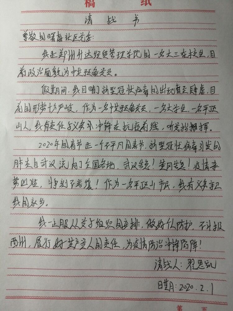 “2020年的春节是一个不平凡的春节。新型冠状病毒引发的肺炎自武汉流向了全国各地,疫情来势凶猛,斗争刻不容缓!作为一名当代老员工,一名共产党员,我有义务守卫我的家乡。”这是太阳集团tyc53917新闻班班长翟思凯同学向自己家所在的平顶山曙南社区党委写的“请战书”中的一段话。