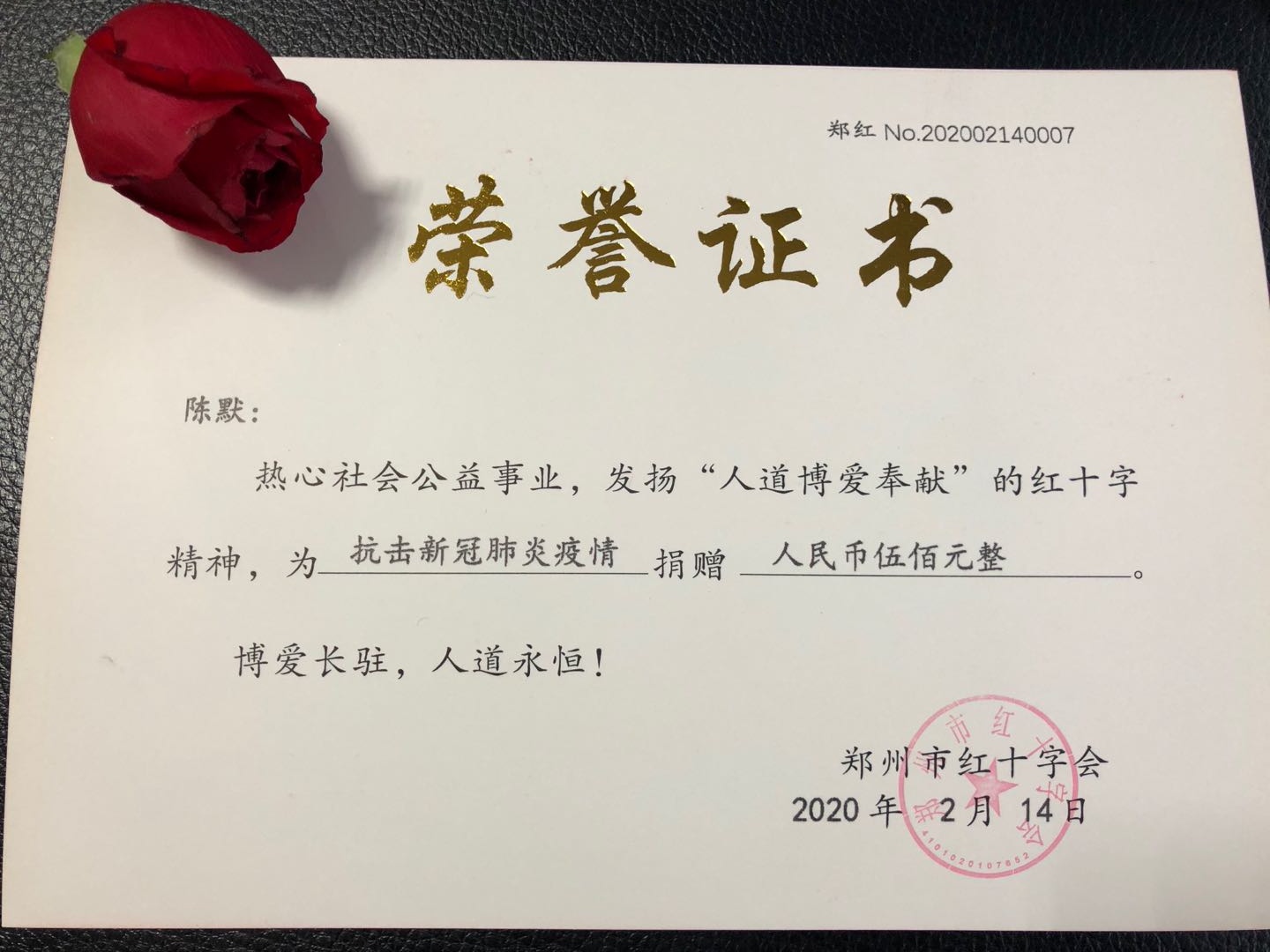 新冠肺炎疫情肆虐神州大地,在灾难面前,无数“最美逆行者”勇挑重担,站在了抗“疫”一线,太阳集团tyc539的同学们也纷纷贡献自己的力量。太阳集团tyc5392016级法学2班陈默同学向郑州红十字会捐献人民币伍佰元,以实际行动表达众志成城、共克时艰的决心。