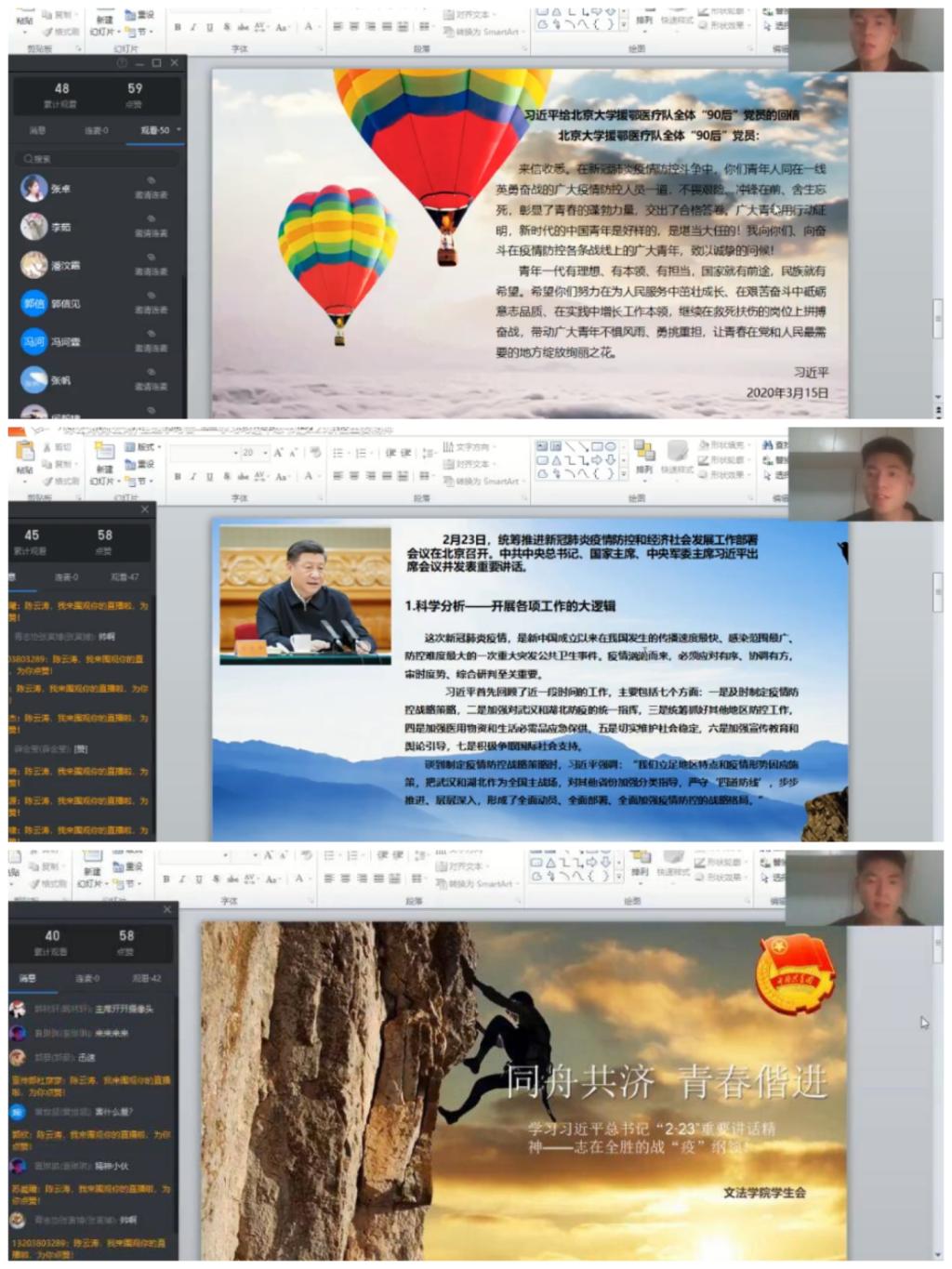 风雨压不垮,苦难中开花。本次线上学习,使同学们认清当前疫情防控的形势,激发了同学们的使命感和责任感。大家纷纷表示要凝聚起同舟共济、共克时艰的磅礴力量和不获全胜决不轻言成功的信心和士气,在以习近平为核心的党中央领导下,共同为疫情防控尽自己的一份力。(文学中心:杨柳)