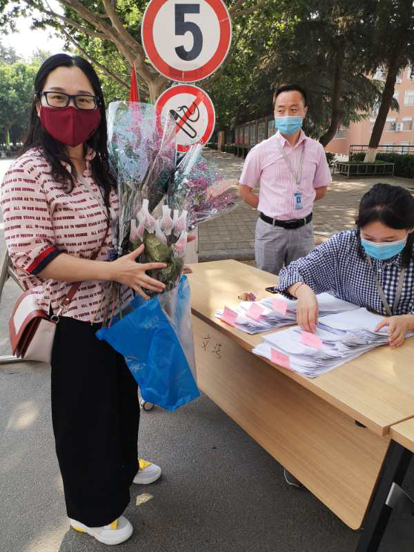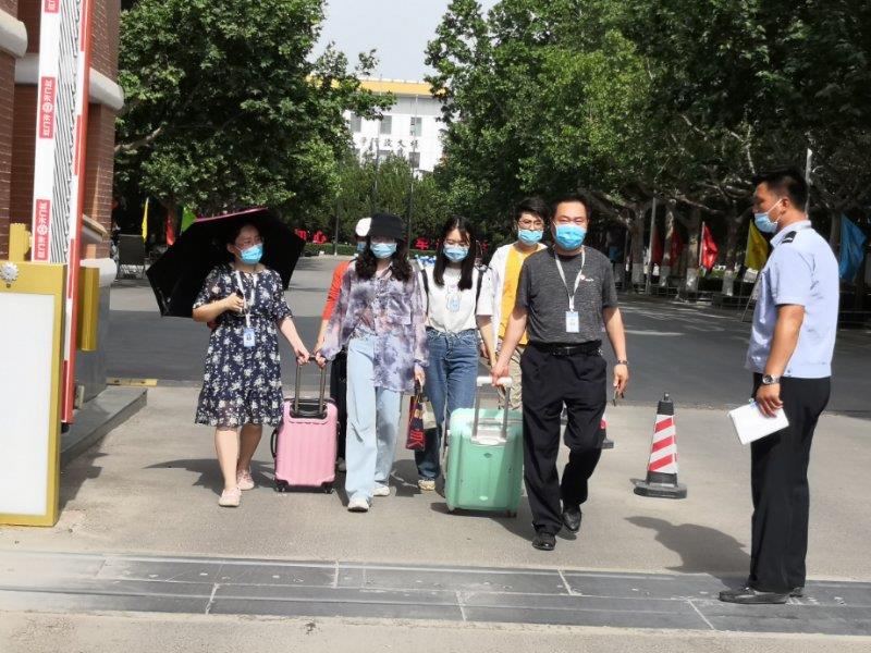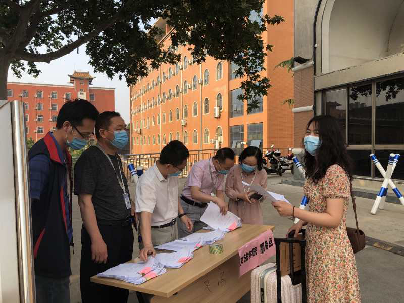 教师志愿者身着白色升达T恤,党员志愿者佩戴党徽,提前到校,负责维持秩序、检查健康码、行李消毒、体温检测、入校引导、行李搬运、家长接待等工作。