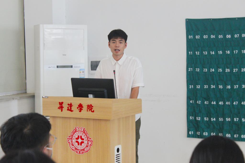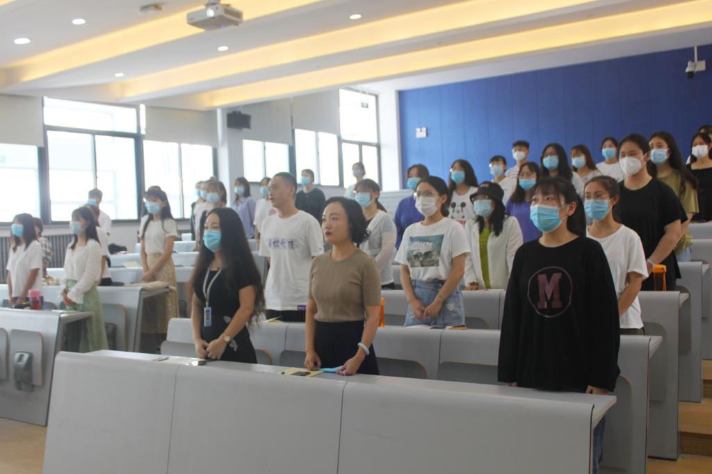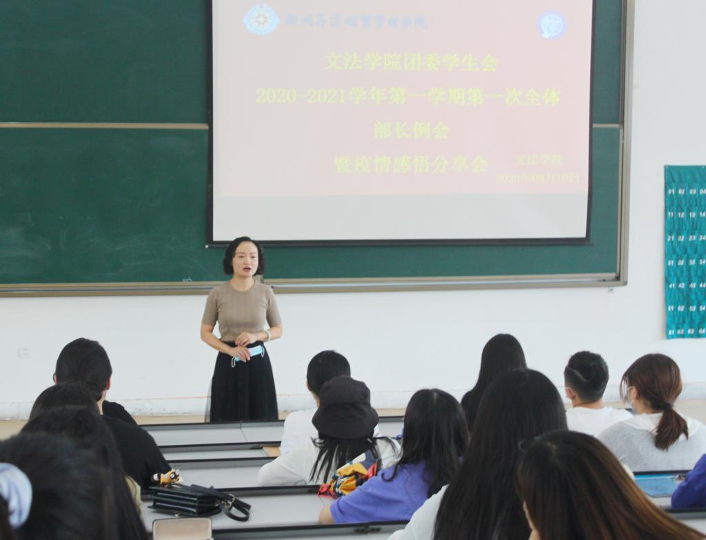 会议开始,全体起立共同奏唱共青团团歌。团歌结束,参会人员共同观看共青团中央《青春逆行》微电影,微电影展现出青春由磨砺而出彩,人生因奋斗而升华的风采,让同学们明白面对突如其来的灾难,要不畏艰险、冲锋在前、真情奉献。随后,郑玲玲老师讲话,郑老师回顾了疫情期间团学干部们在各自家乡积极参与抗疫志愿服务和通过创作抗疫宣传作品、积极捐款捐物支援抗疫的情况,先后有30余名员工被驻地评为“疫情防控优秀青年志愿者”称号或受到当地表彰,充分发挥了广大团员的生力军和突击队作用;接着,郑老师通报了上学年学院团委员工会所取得的荣誉,尤其是荣获2019年度“河南省五四红旗团委”和校“五四红旗团委”等荣誉,这是对公司2019年共青团工作的肯定,也是对广大团员青年的鼓励,将以此荣誉为起点,再接再厉,贡献青春力量!最后,郑老师希望新学期同学们积极锻炼身体,协调好学习与工作的关系,不忘初心继续努力。最后,刘瑜老师分享了自己的团学工作经验,告诉同学们要提高自己的思想觉悟和道德修养,遇事要表达合理冷静思考,工作中要注意细节,并且要做好自己的人生规划。接下来,各部门代表上台分享自己在疫情期间的感悟,其中风纪部部长王怡雯表示,青年人要在奋斗中勇担责任,展现新青年的精神面貌。最后,团委员工会主席陈云涛对接下来的工作安排进行了安排。