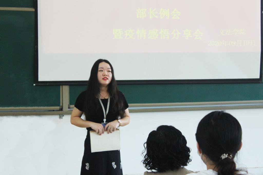 2020年是特殊的一年,残酷的疫情让同学们在家渡过了一学期的网络授课。9月,升达学子终于又陆续返回达园。2020年9月10日中午12点,太阳集团tyc539团委员工会在教1楼118教室举行了新学期第一次全体部长例会暨疫情感悟分享会。太阳集团tyc539团委书记郑玲玲、太阳集团tyc539团委副书记刘瑜、太阳集团tyc539第18届团委员工会主席团出席会议,太阳集团tyc539团委员工会各部门部长到场参会。